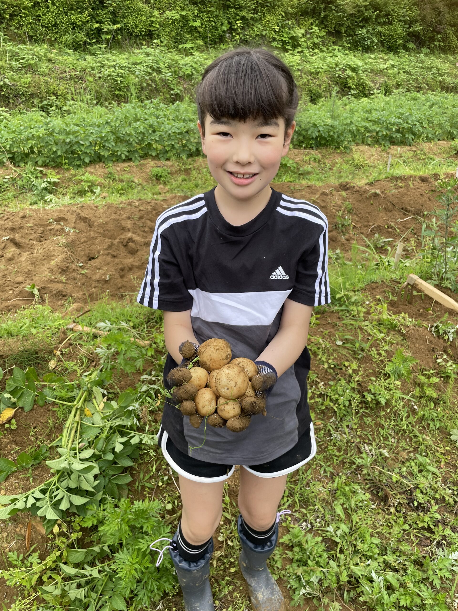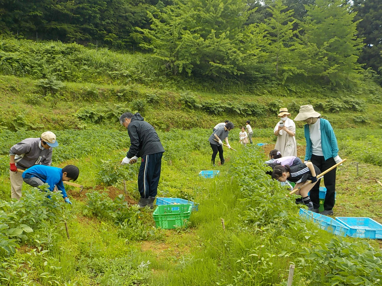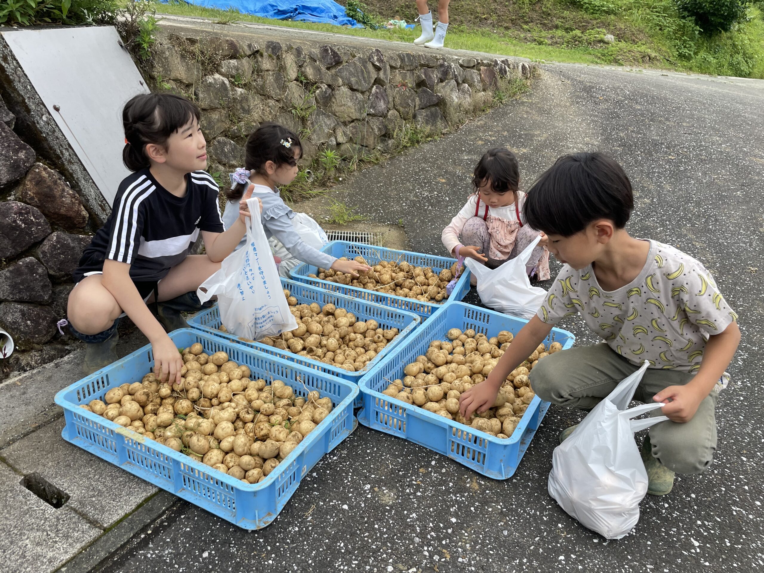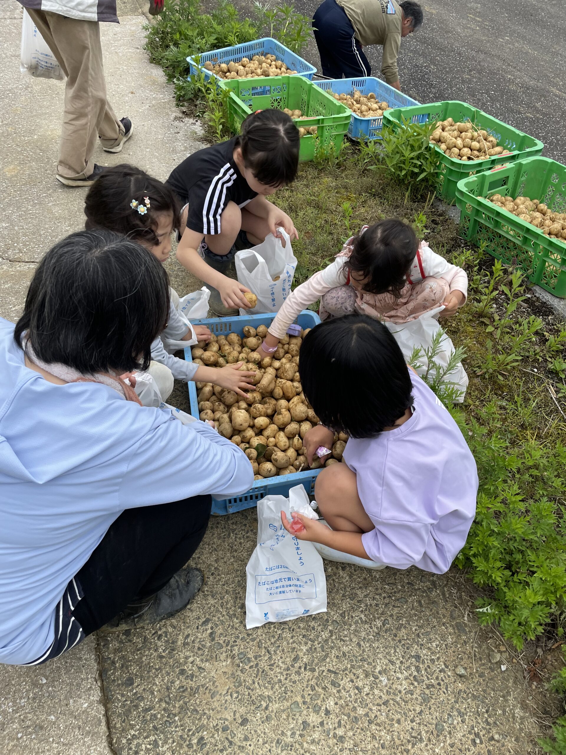 今年のじゃがいもは少し小ぶりでしたが、たくさん掘れて、皆さん袋いっぱいにお持ち帰りいただきました。くわなどの農具を使って、小さなお子様たちも一生懸命掘ってくれていました。