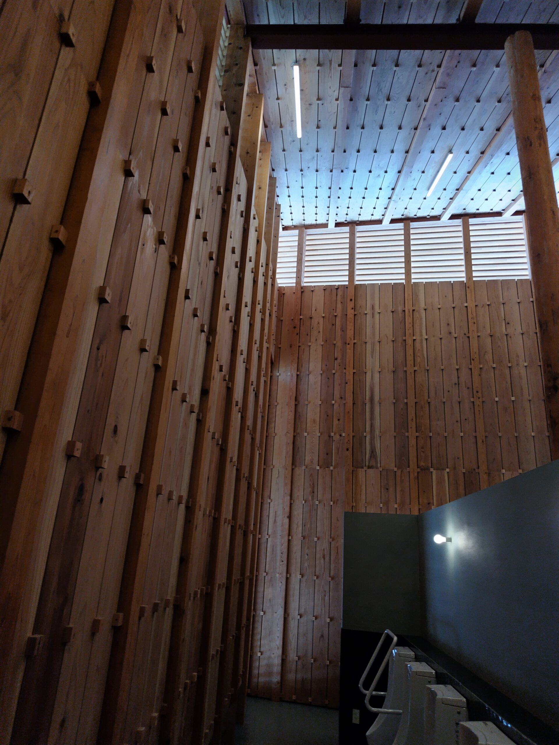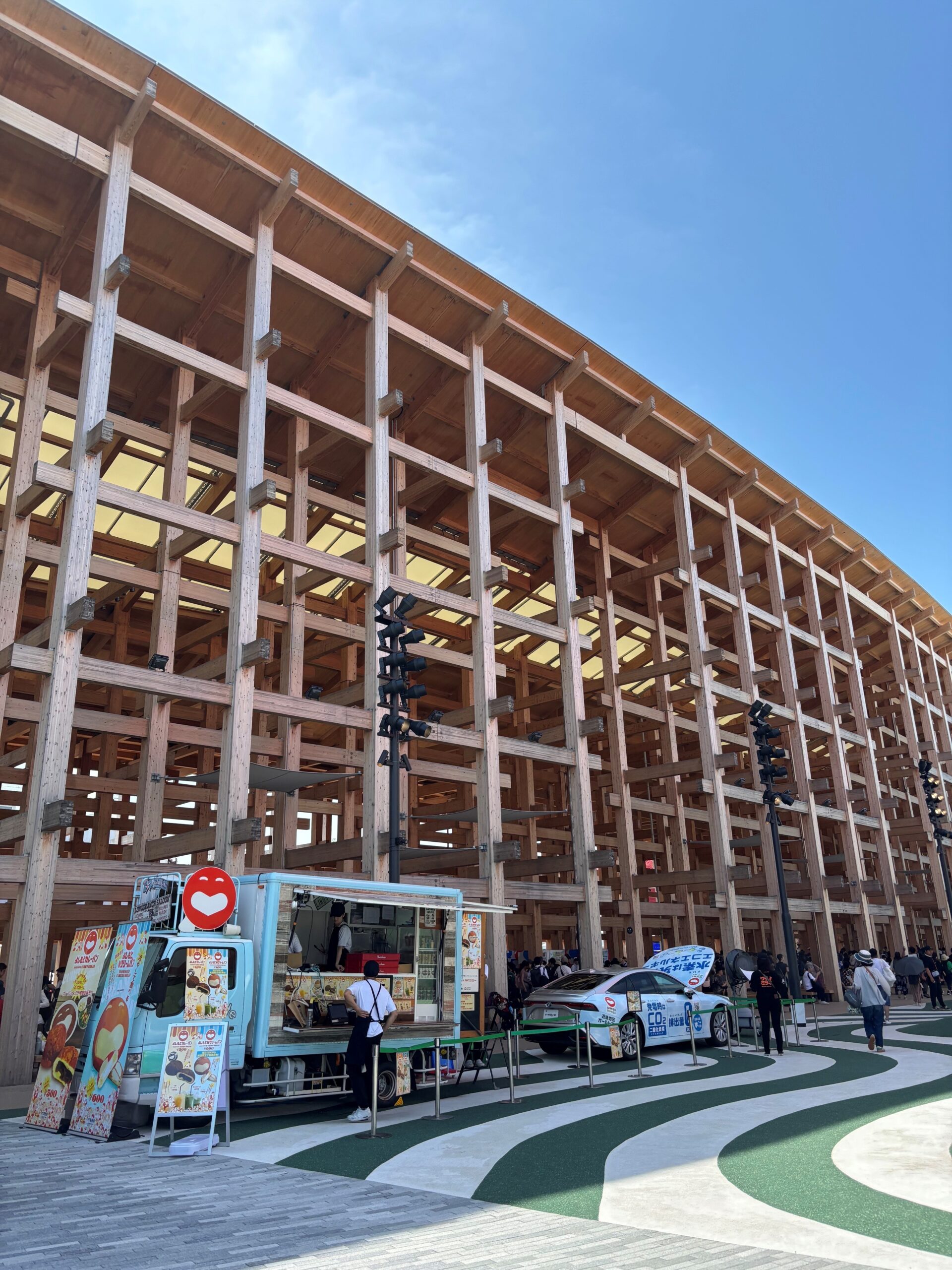 万博の建築物は、会期6カ月という限られた期間のため解体・再利用を前提とした設計がされている点もとても印象的でした。中でも興味深かったのは、トイレ棟における木材の仕上げ方法です。内外の仕上げ材にビスやボルトで穴を開けることなく、木のブロックで押さえるかたちで固定されており、材料を傷つけることなく取り外し・再利用できる工夫が施されていました。一見目立たない細かな部分にも、環境への配慮や工夫がしっかりと感じられ、建築に関わる立場としてとても心に残りました。