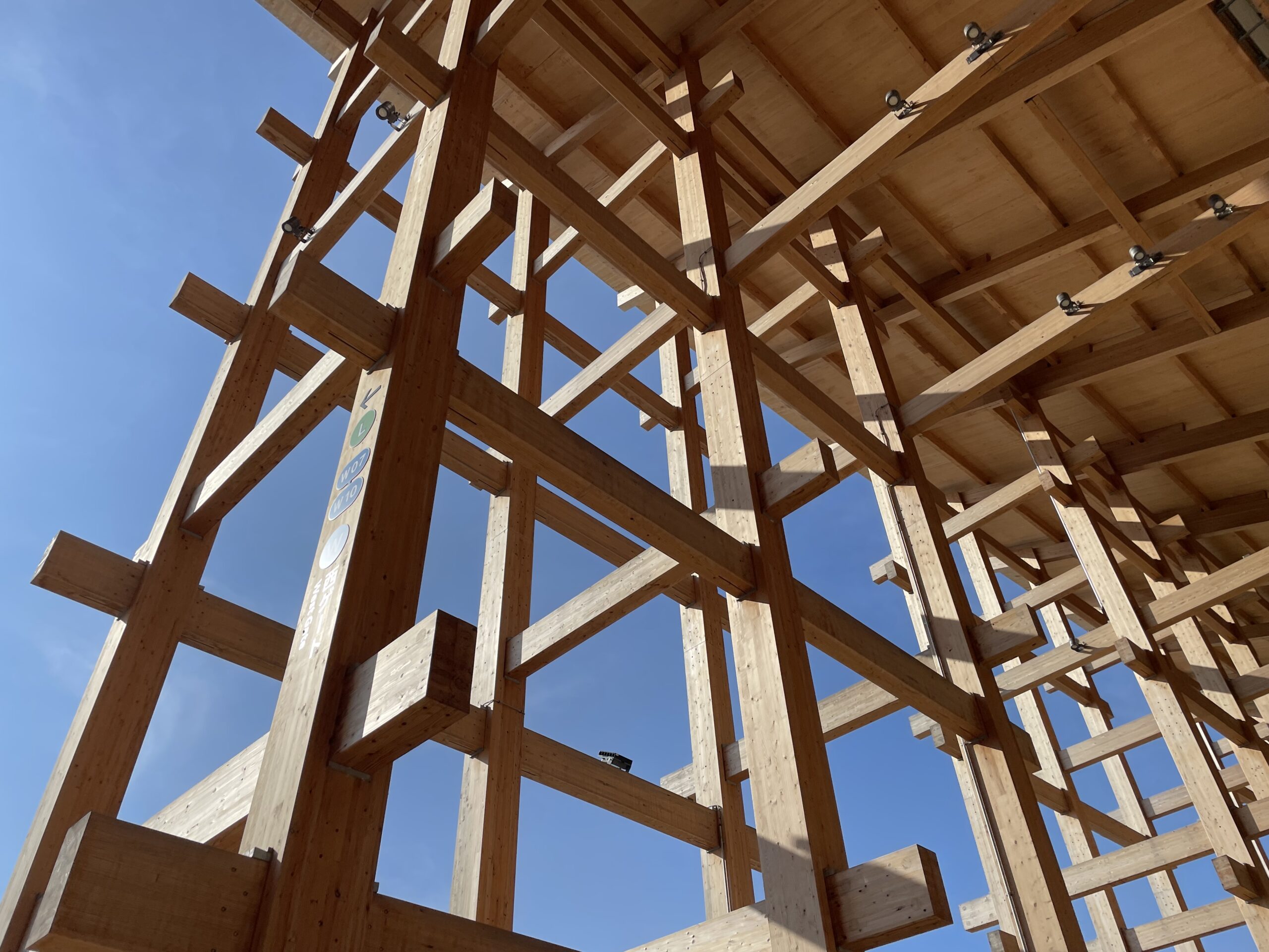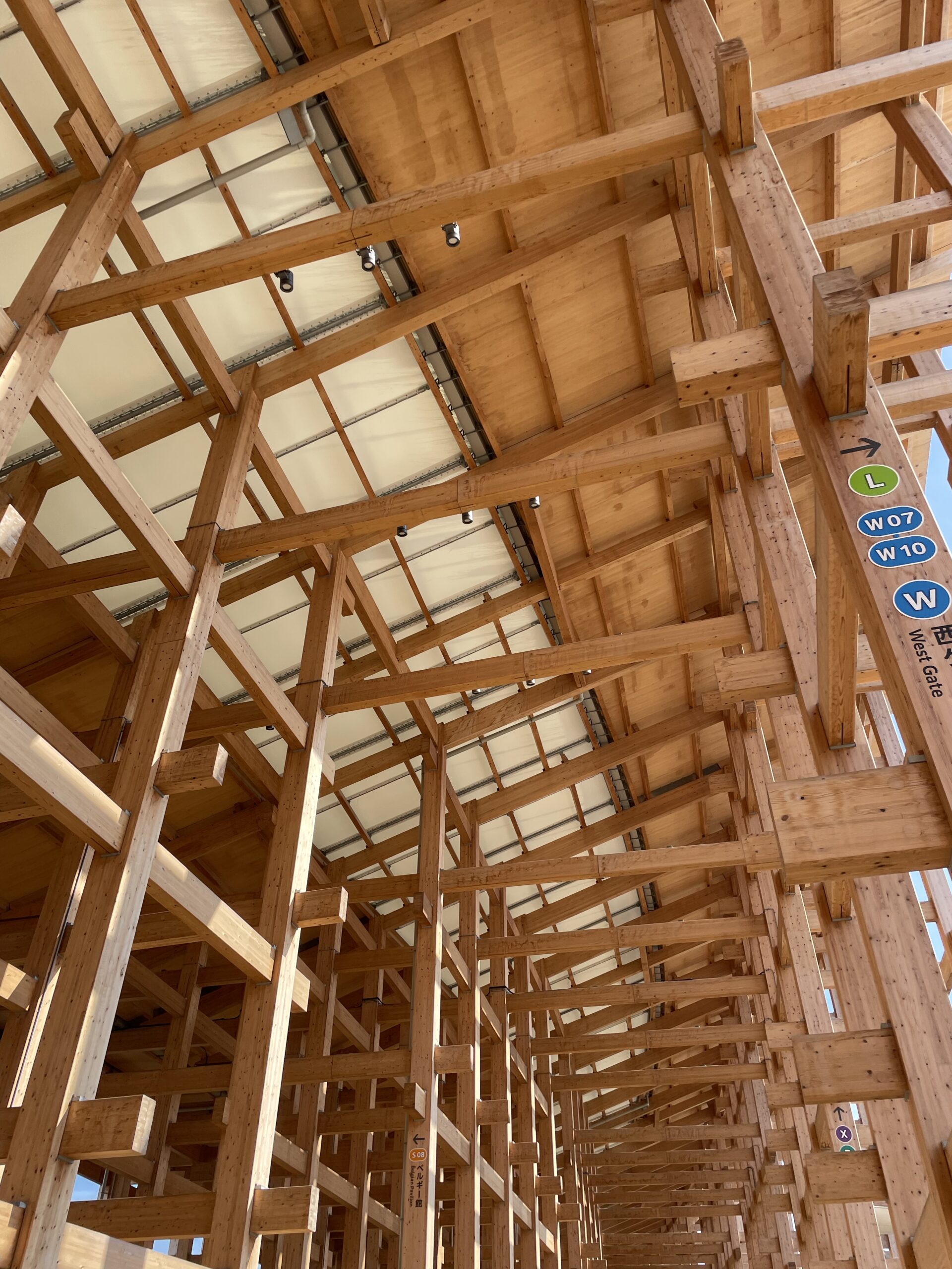 まず注目したのは、会場の象徴とも言える「大屋根リング」です。直径は約615mにも及び、木造建築としては世界最大級のスケールを誇ります。この大屋根には国産木材が多用されており、中でも高知県産のスギやヒノキが全体の約4割を占めていることに、喜びと誇りを感じました。高知で建築に携わる私たちにとって、地元の木材がこのような世界的な舞台で活用されていることは、大きな励みになります。構造面で特に印象に残ったのが、CLT(直交集成板)の積極的な採用です。CLTは、複数の板材を直交するように貼り合わせた構造材で、耐力性や施工性に優れるだけでなく、木材ならではの温もりを感じさせつつ、スピーディな施工を可能にする点が特長です。弊社ショールームでも採用している素材であり、今回の大屋根リングでは、床・梁・壁などさまざまな箇所に使用され、CLTは現代木造建築の可能性を大きく広げる素材であると再認識しました。