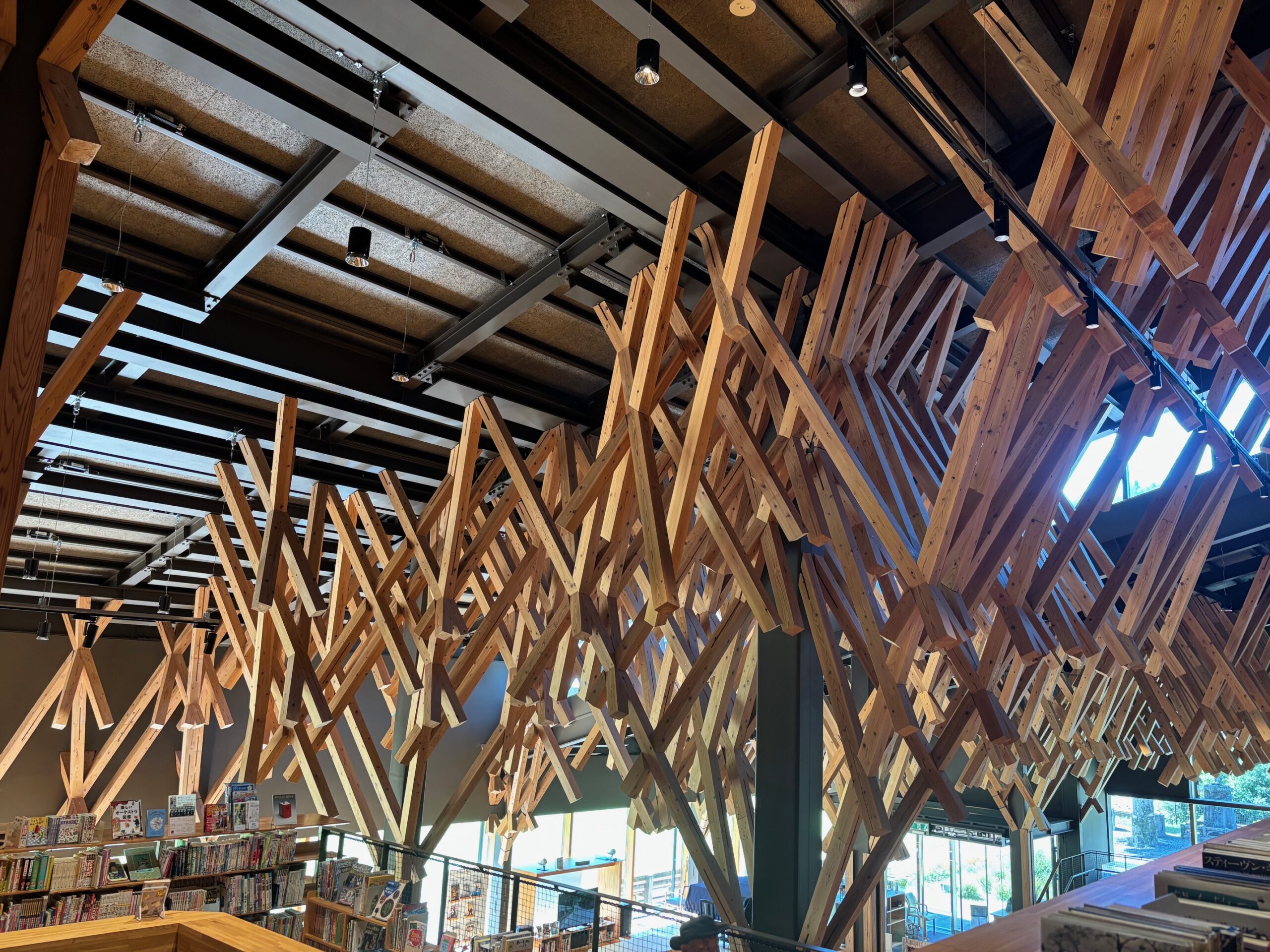 建物は鉄骨と木造の混構造で、梼原町のヒノキと杉をふんだんに使用しており、まるで森の中にいるかのような空間でした。天井に使われている工法は日本の伝統的な地獄組に強い影響をうけたデザインの四叉菱格子(よんさひしごうし)呼ばれ、その一本一本に荷重を分散させることで、耐震性にも優れています。